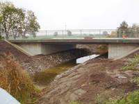 Ersatzneubau Einfeldbrücke mit Stahlbetonplatte, Gründung auf 21,5 m langen Bohrpfählen du 75 cm, Spundwandkasten, Straßenbau auf 60 m Länge, Gewässerausbau im Bauwerksbereich |