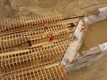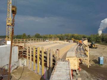 Montage von Seitenblechen und Sondergeländer, Sichtbetonscheiben mit eingebauter LED-Beleuchtung, bewehrter Aufbeton, verdübelte Überbauverlängerung, Betoninstandsetzung, Gewässerausbau, Pflasterbau |