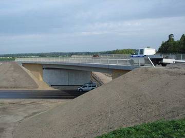 Neubau dreistegiger Spannbetonplattenbalken, gekrümmt im Grundriß, gekrümmt im Aufriß, Gefällewechsel auf dem Bauwerk, extrem schiefwinklig, Flachgründung, Verlinkerung |